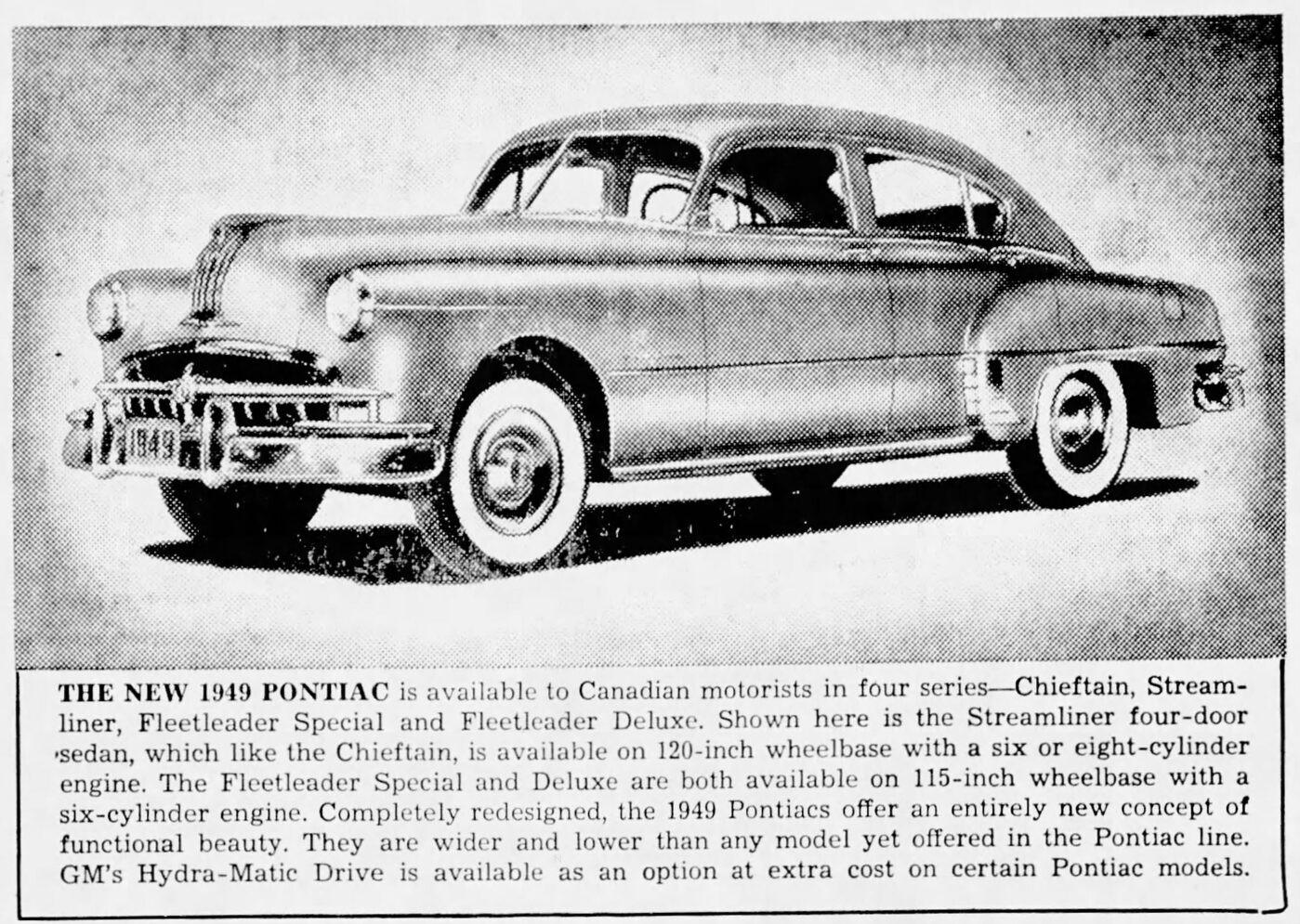 New 1949 Pontiac Advertisement - Canadian. This shows the offering of the Chieftain, Streamliner, Fleetleader, Fleetleader Deluxe to Canadian Motorists.