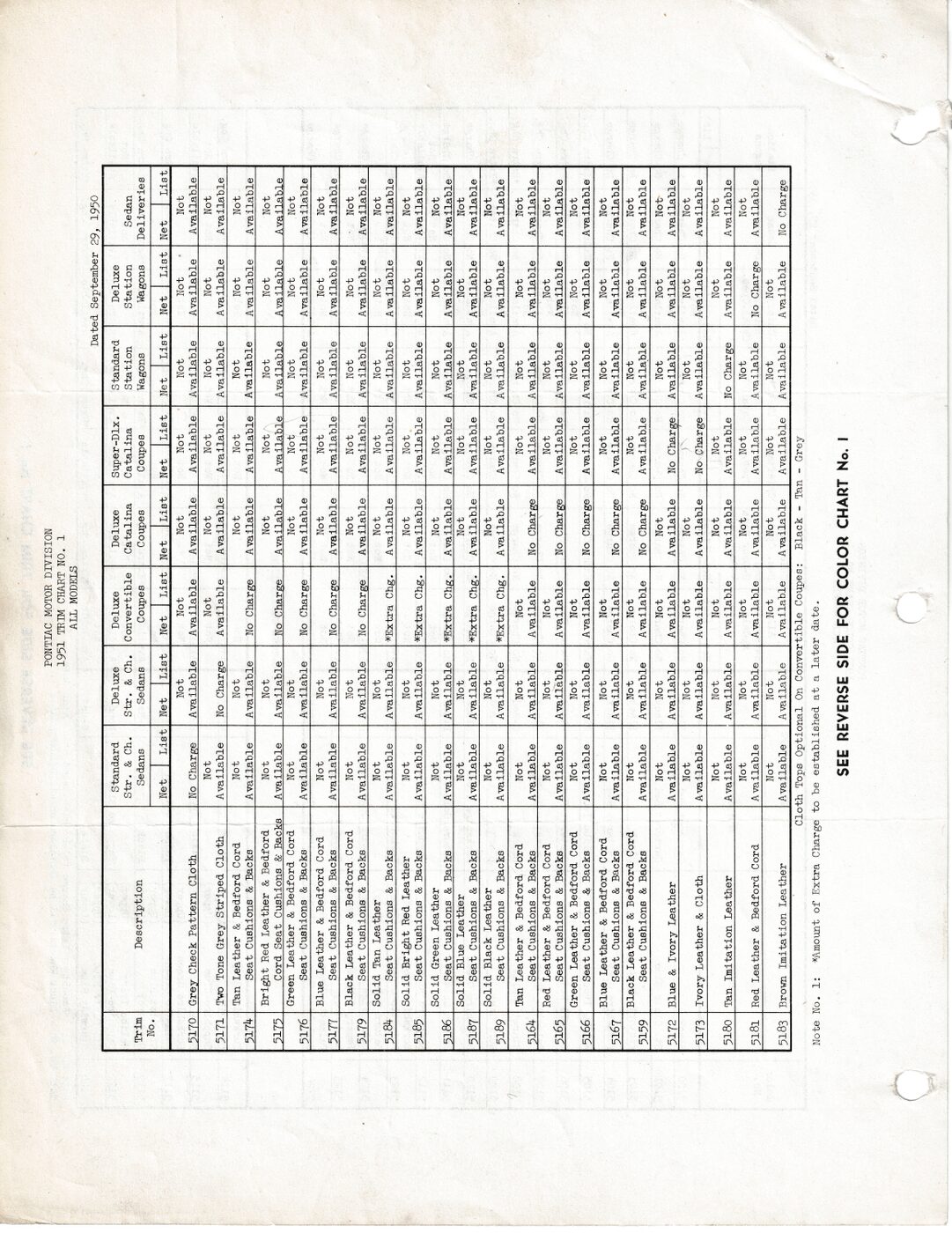 1951 Pontiac Color and Trim charts No. 1 sent to dealers. Document dated Sept. 29 1950