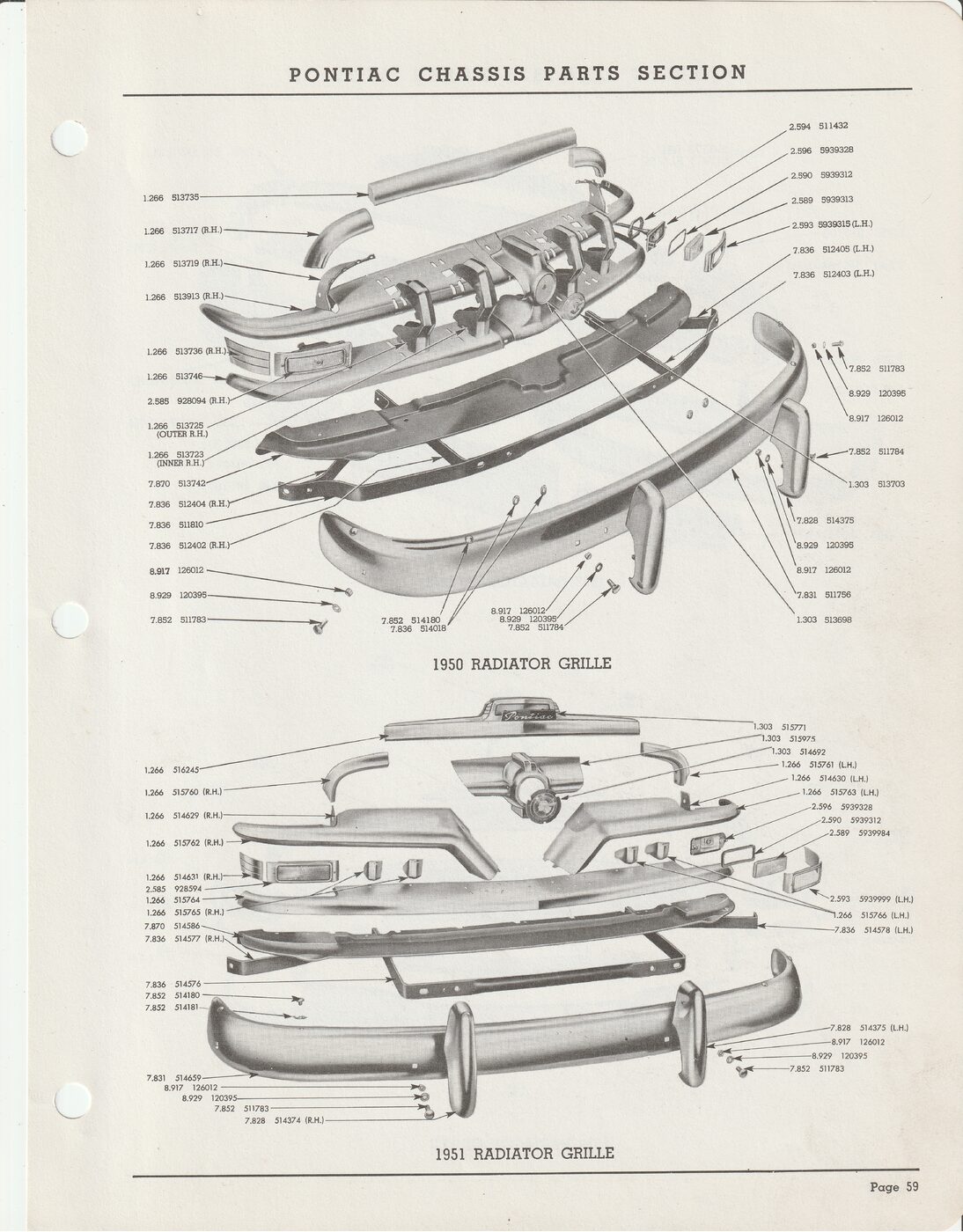 1950 and 1951 radiator grille assemblies, includes front bumper parts. The 1951 assembly diagram is used for 1952 reference also. Grille bar/name plate are different, and 1952 lacks the extensions beside the park lights. Group research will list correct part numbers per year.