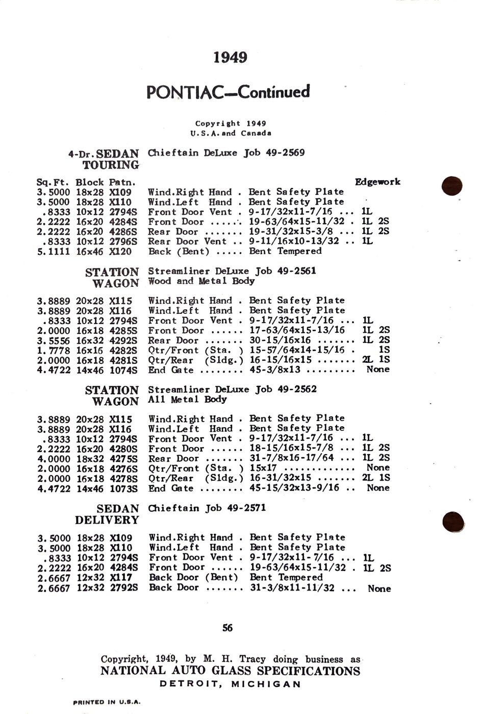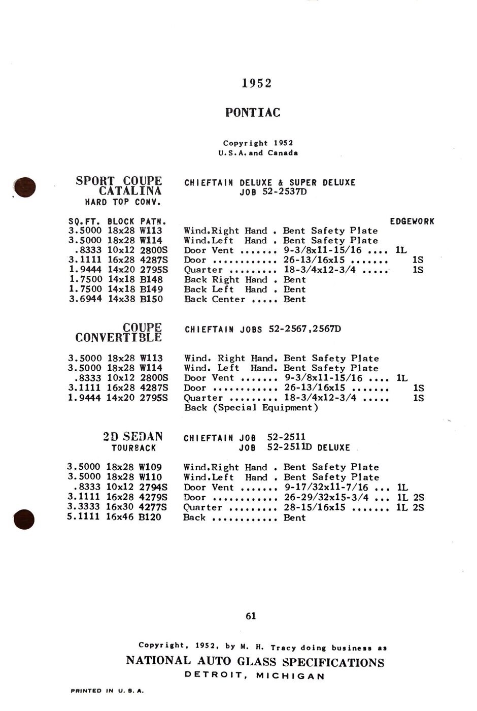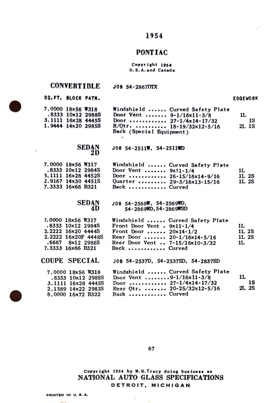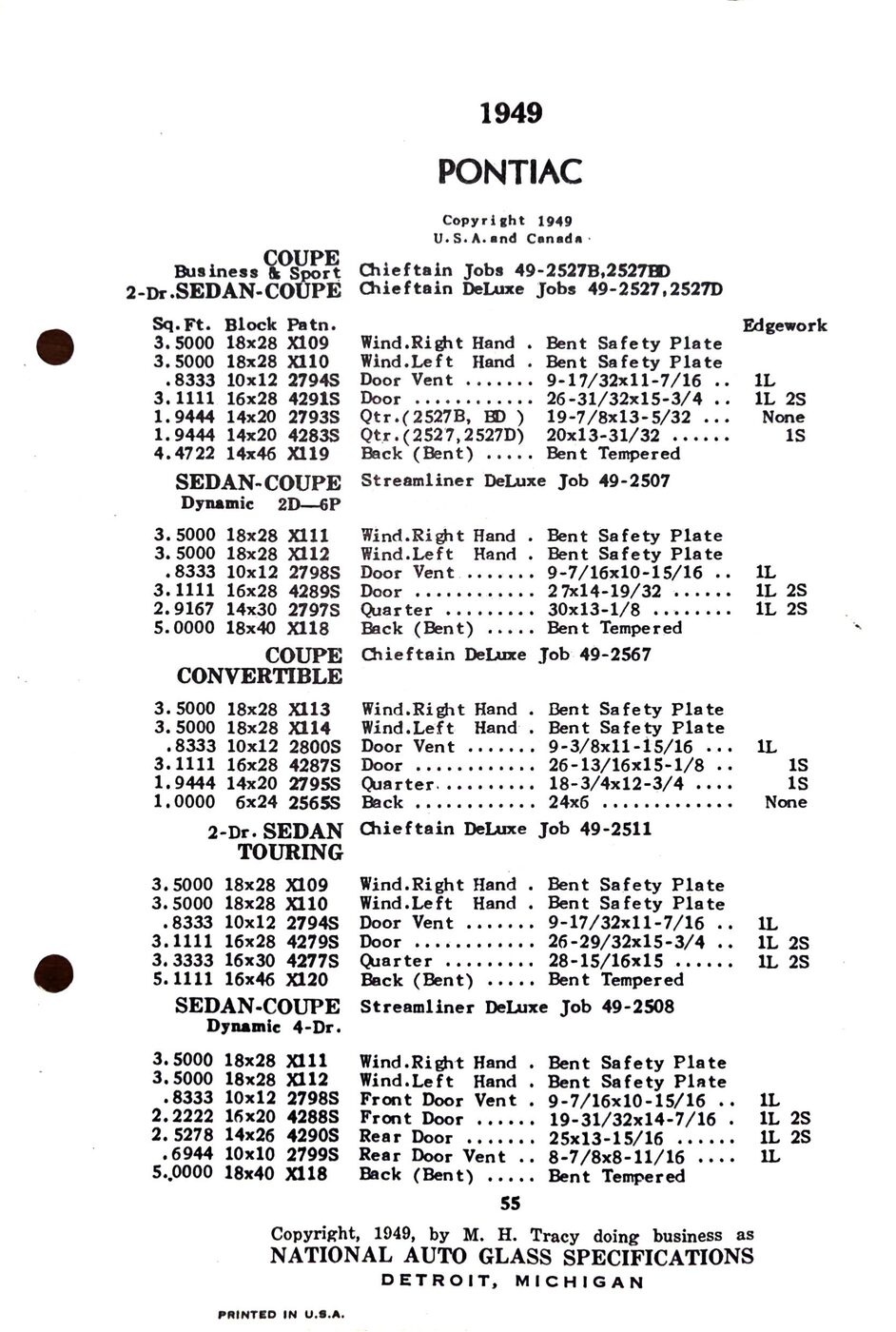 The 1949-54 Pontiac glass specifications from the National Auto Glass specs book. Lists original glass dimensions, pattern numbers and edge work.