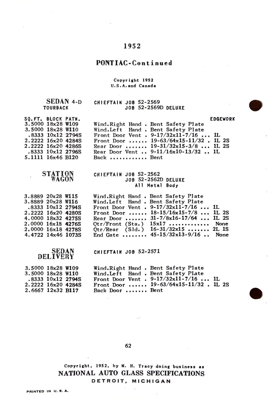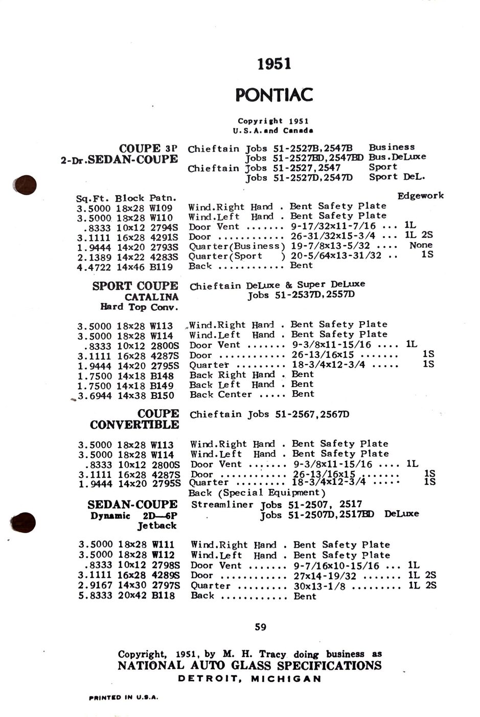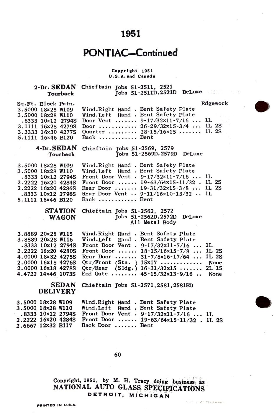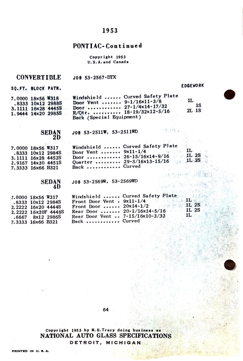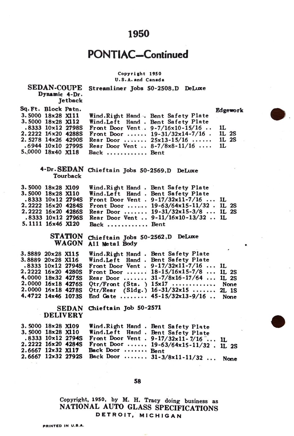 The 1949-54 Pontiac glass specifications from the National Auto Glass specs book. Lists original glass dimensions, pattern numbers and edge work.