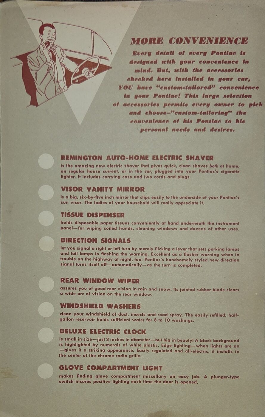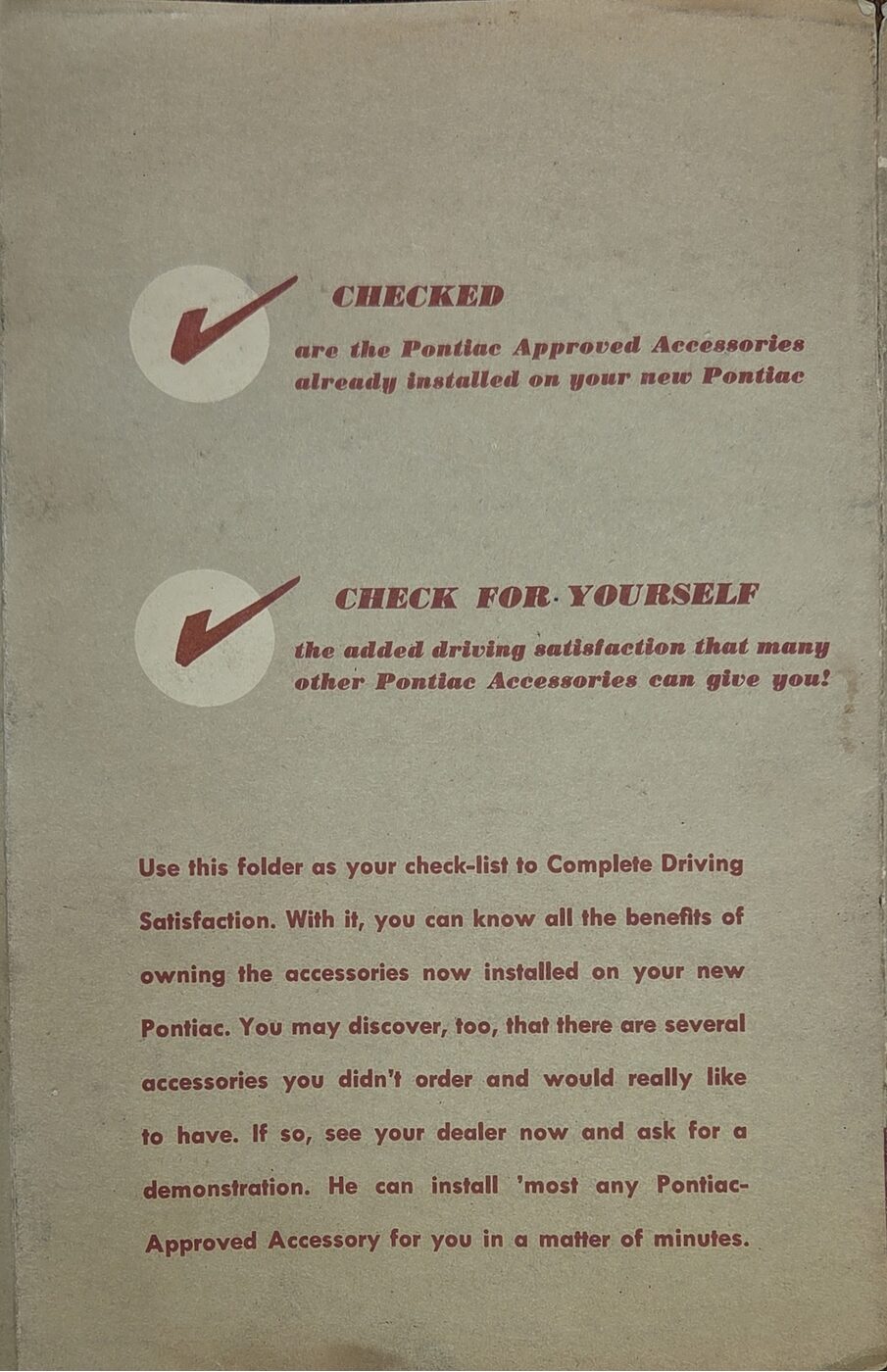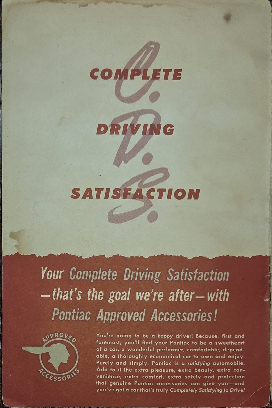 Your new Pontiac has C.D.S (Complete Driving Satisfaction) Accessory Booklet. This is penciled "1950" on the back cover, however the car trunk handle depicted in the booklet appears to be a 1949. No other year marked on the booklet. I'm posting this as 1949/1950.
