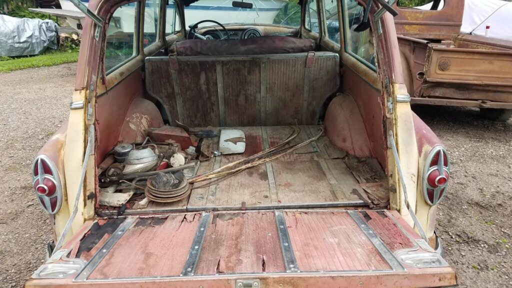 Like many Midwest survivors, the wagon has its share of rust issues — mainly in the front floor area (thanks to a broken windshield that let water in for decades), the lower rear tailgate, left quarter panel, and driver’s door. The rest of the car, though, is surprisingly solid and mostly complete.
