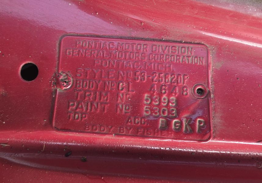 1953–1954 Pontiacs, the body tag is located on top of the passenger side of the firewall.