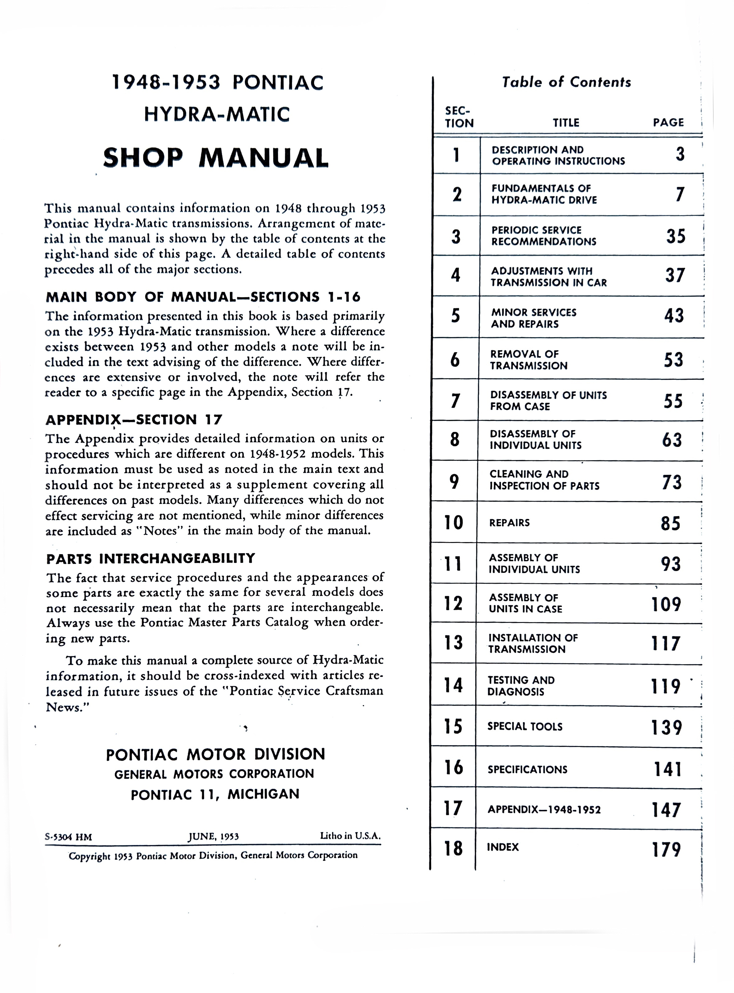 Note: This gallery displays all pages from the 1948-1953 Pontiac Hydra-Matic Transmission Shop Manual (This manual predates the 1954 Model, but the information will carry over).