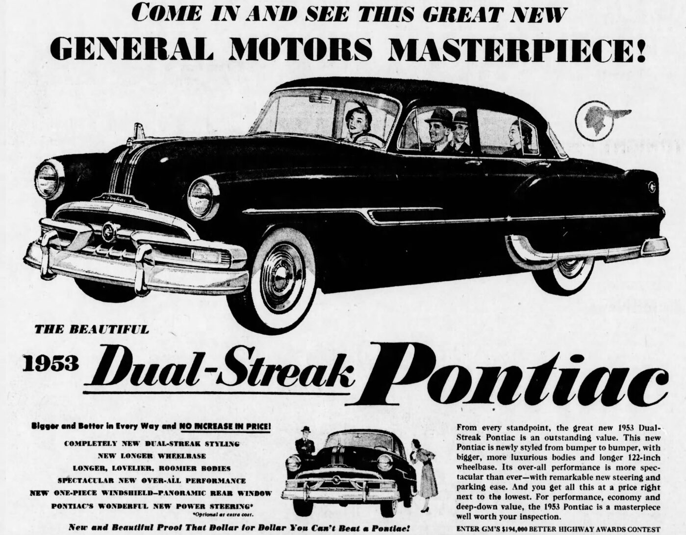 Great new General Motors Masterpiece - Beautiful New Dual-Streak 1953 Pontiac! Newspaper ad