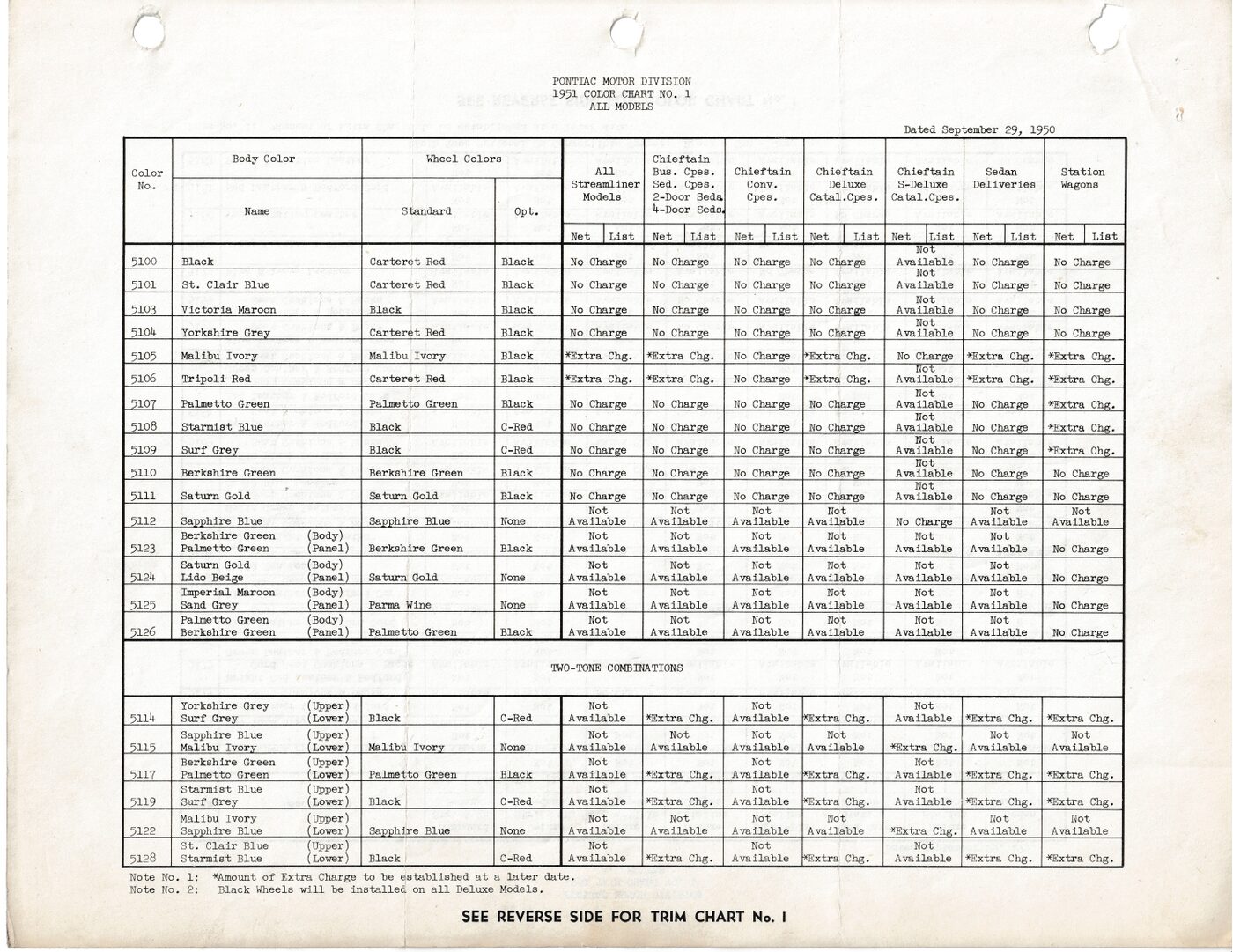 1951 Pontiac Color and Trim charts No. 1 sent to dealers. Document dated Sept. 29 1950