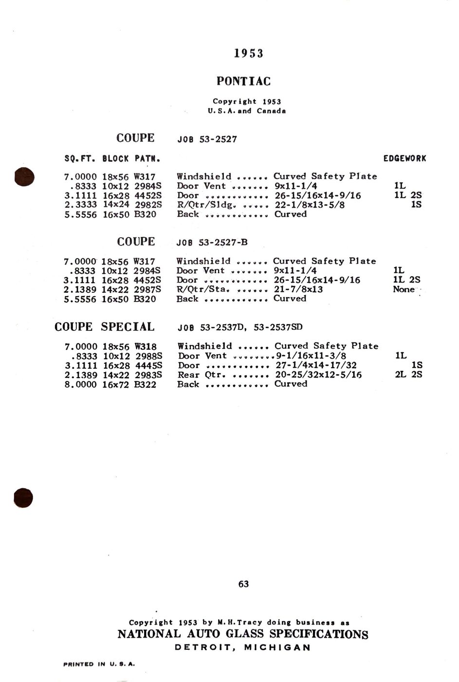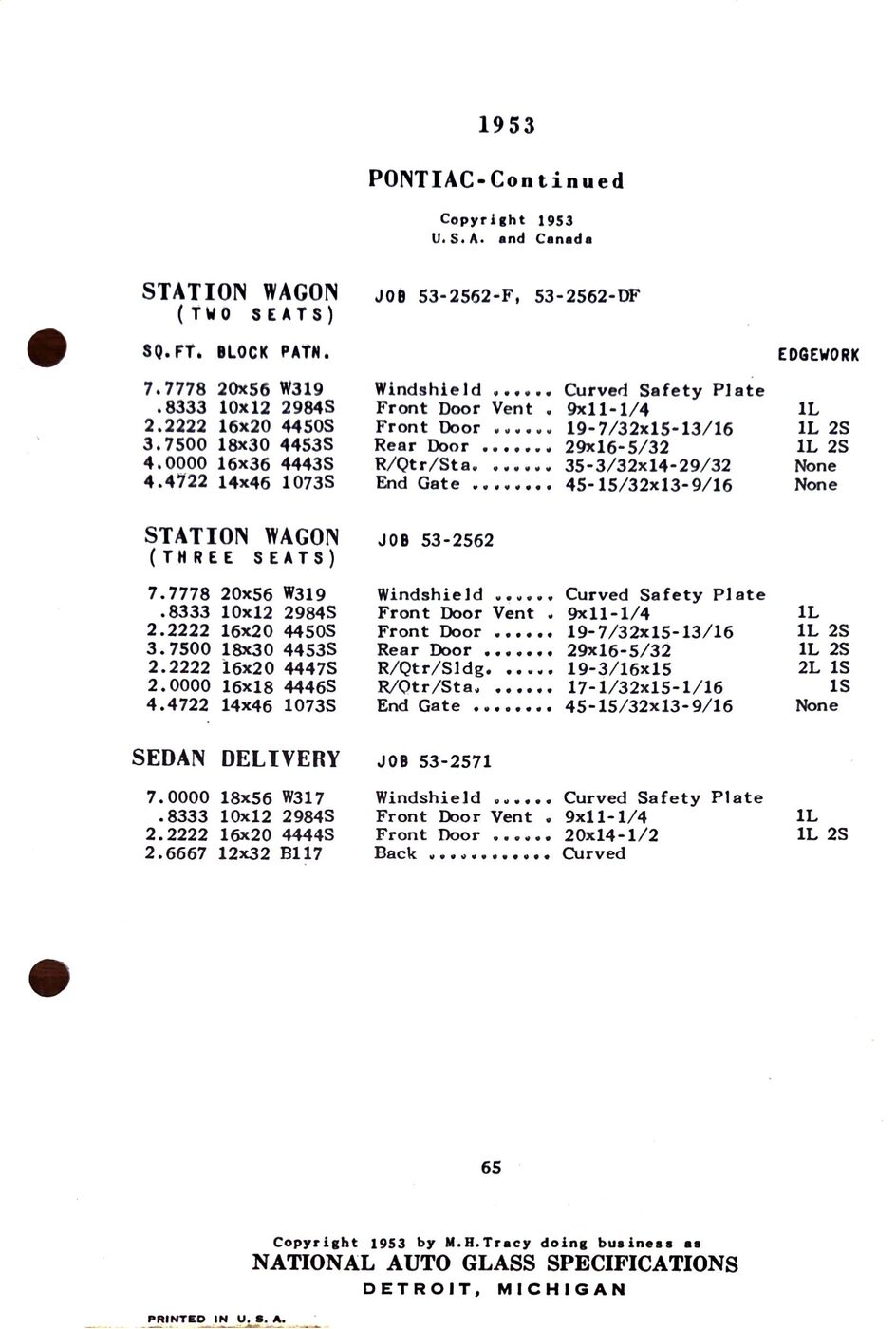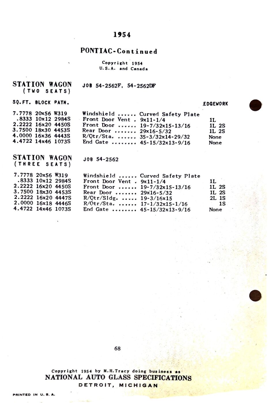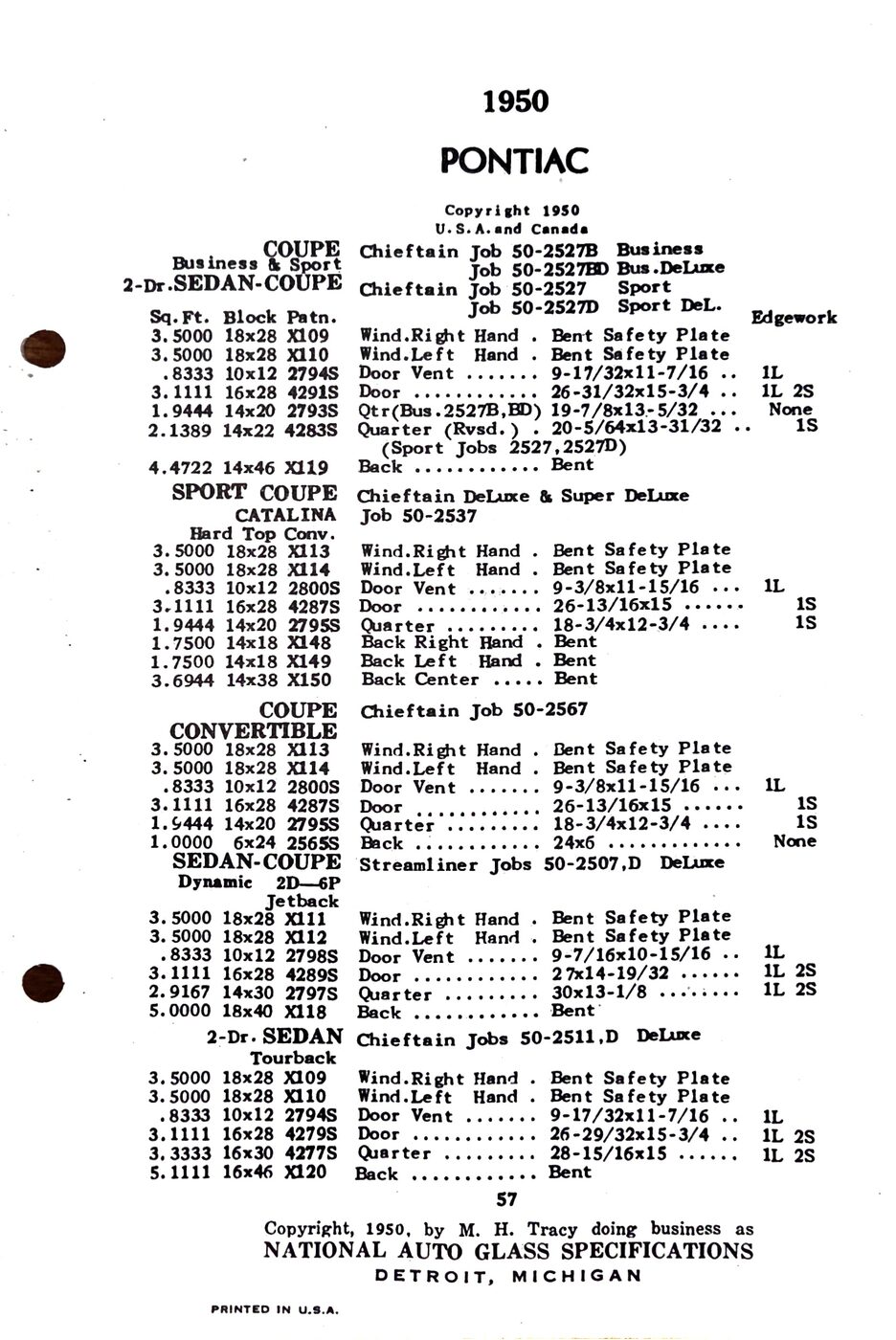 The 1949-54 Pontiac glass specifications from the National Auto Glass specs book. Lists original glass dimensions, pattern numbers and edge work.