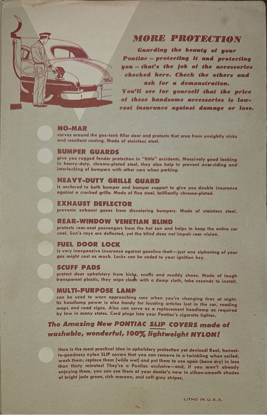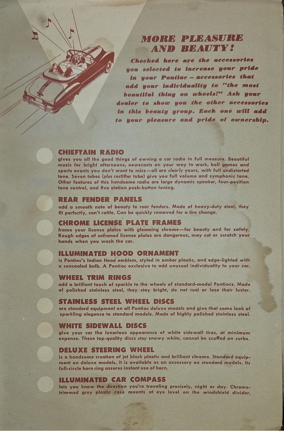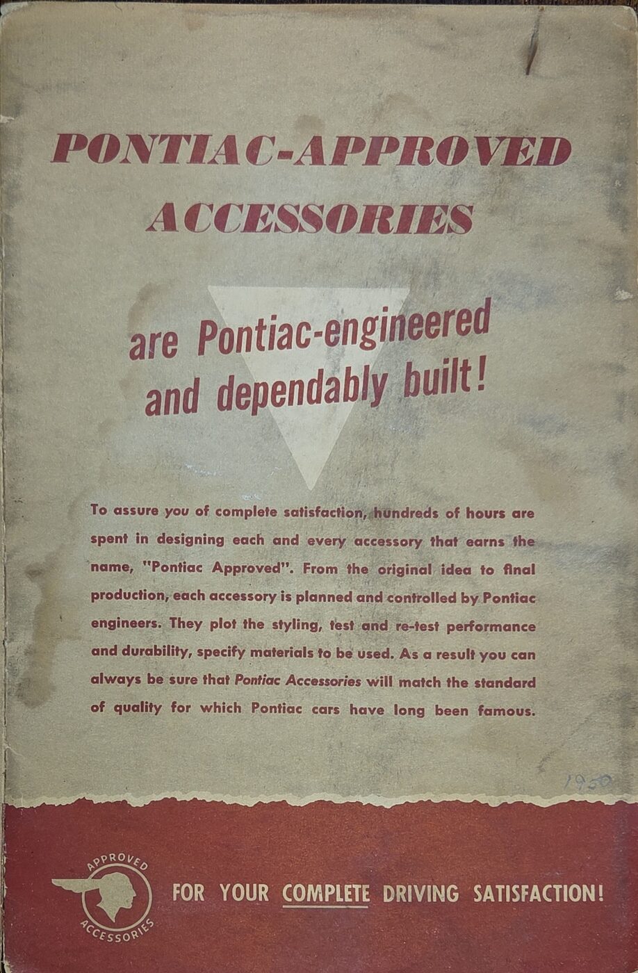 Your new Pontiac has C.D.S (Complete Driving Satisfaction) Accessory Booklet. This is penciled "1950" on the back cover, however the car trunk handle depicted in the booklet appears to be a 1949. No other year marked on the booklet. I'm posting this as 1949/1950.