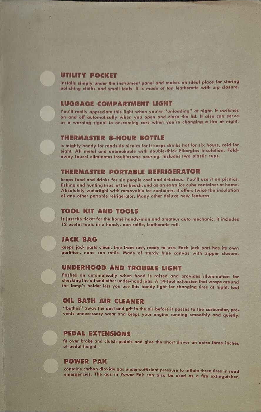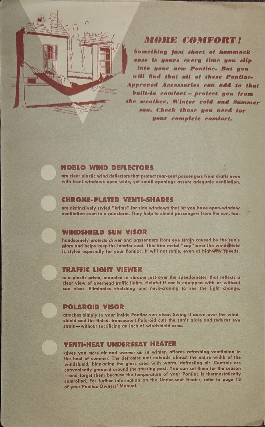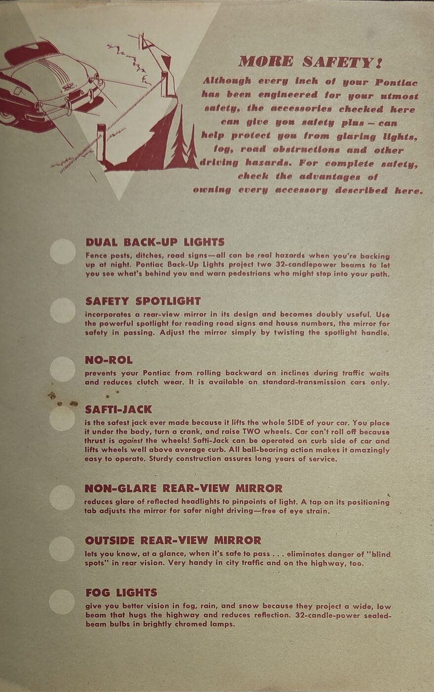 Your new Pontiac has C.D.S (Complete Driving Satisfaction) Accessory Booklet. This is penciled "1950" on the back cover, however the car trunk handle depicted in the booklet appears to be a 1949. No other year marked on the booklet. I'm posting this as 1949/1950.