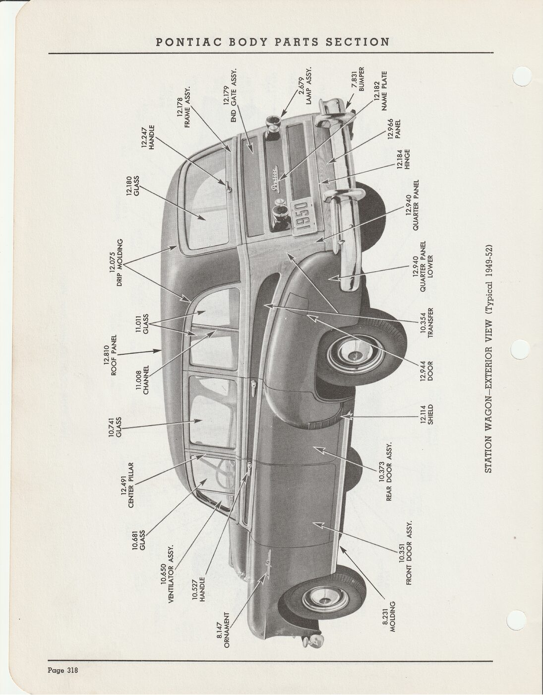 Typical 1949-52 Pontiac Station Wagon Exterior View showing group numbers for parts.